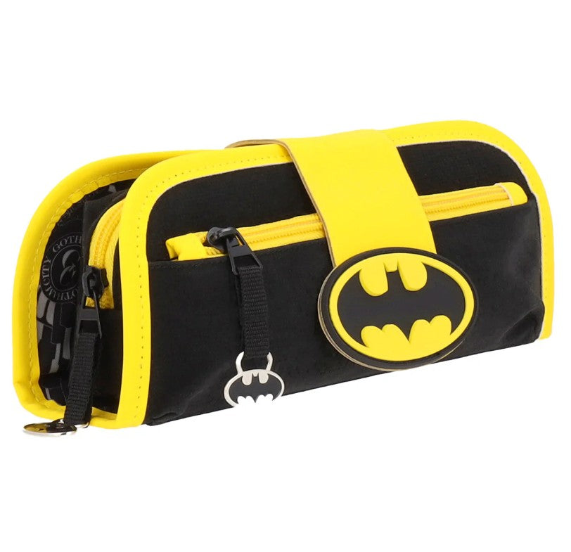 Esta estuchera negra de Batman cuenta con un parche de goma del logo de Batman, una bolsa frontal de fácil acceso y cierres de metal con el logo del superhéroe. Ideal para transportar tus útiles escolares o artículos de escritorio de manera organizada y con estilo.