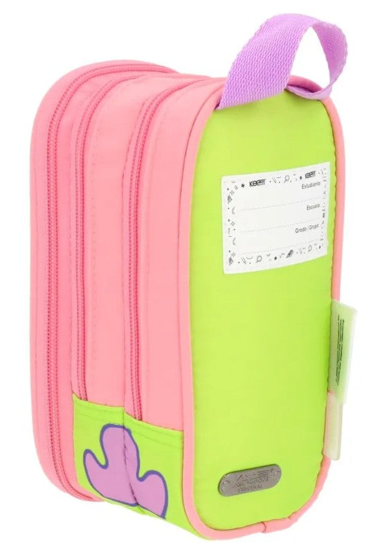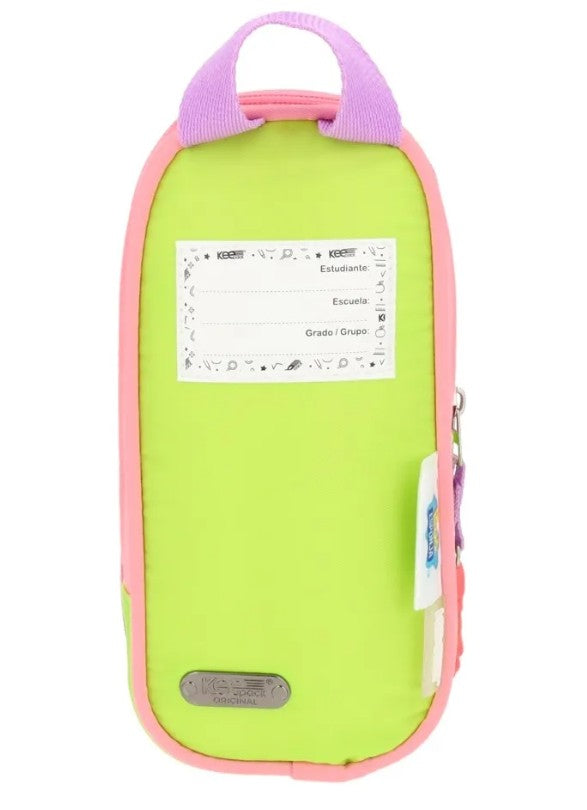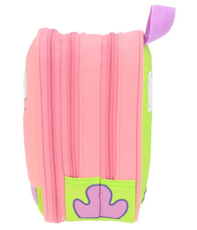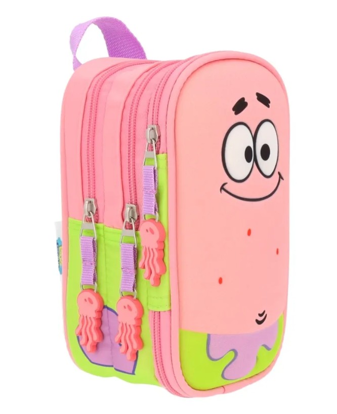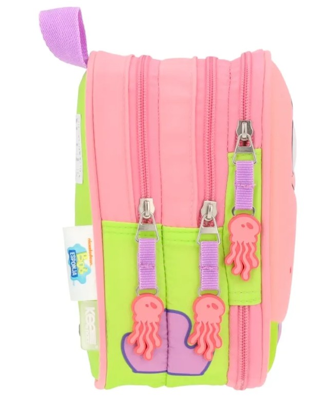 Lapicera Bob Esponja elaborada en textil color rosa, diseño de Patricio Estrella, asa suave y tres compartimentos con cierre.