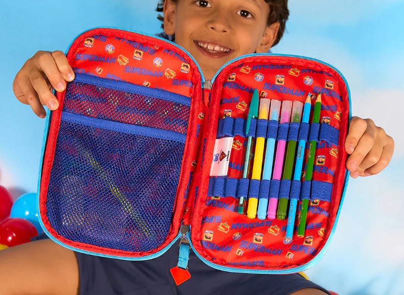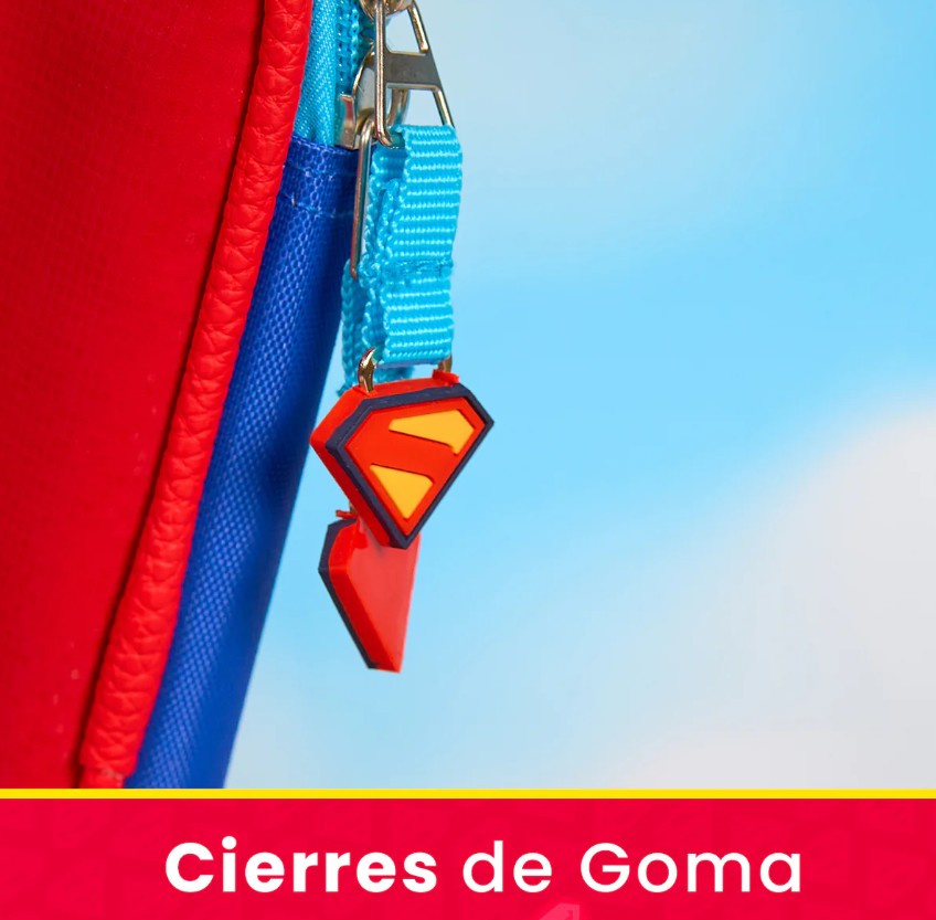 Lapicera DC Comics Superman elaborada en poliéster con diseño alusivo al modelo, compartimento principal con cierre de cremallera e interior con múltiples compartimentos.